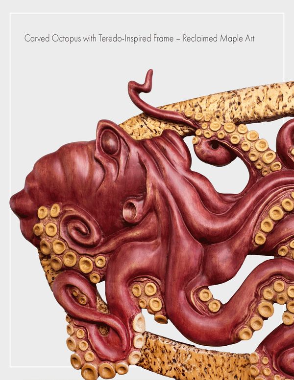 Hand-carved from a single solid piece of reclaimed maple butcher block tabletop, this unique artwork features a striking octopus entwined in motion, emerging from the wood’s natural grain. The piece is lightly washed with acrylics, allowing the warm maple tones and organic textures to shine through. Encasing the creature is a frame inspired by the natural tunnels of teredo worms, echoing the raw, marine-worn beauty of driftwood and shipwreck timbers. A blend of craftsmanship, sustainability, and coastal storytelling—each piece is one-of-a-kind.