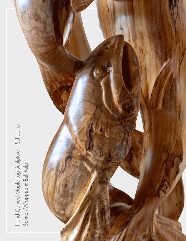This unique 6-foot maple log sculpture captures the natural beauty of decay and marine life in a stunning, artistic form. Crafted from an end-of-life rotted maple log, the piece features a school of three salmon intricately carved to appear wrapped in flowing bull kelp. A clear protective finish enhances the rich, natural colors and textures of the wood’s decay, preserving its organic charm while highlighting every detail.