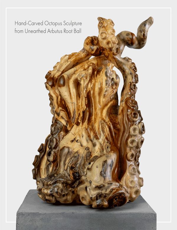 This unique octopus sculpture is meticulously carved from a rotted, unearthed arbutus root ball, showcasing the natural beauty and character of the wood’s weathered textures. The piece is clear-coated to enhance and preserve the striking, organic patterns created by the wood’s aged, rustic decay.