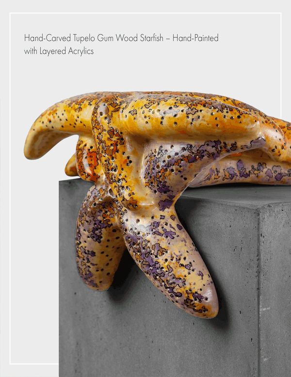 Beautifully hand-carved starfish sculpture. Crafted from premium Tupelo gum wood, known for its fine grain and carving ease, each piece is meticulously shaped to capture the organic form and subtle textures of a real starfish.
