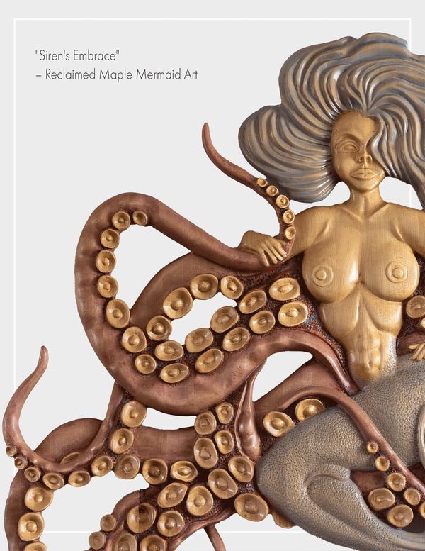 Dive into myth and mystery with "Siren's Embrace", a one-of-a-kind, hand-painted artwork featuring a mythical mermaid surrounded by the sinuous reach of octopus tentacles. Crafted on a reclaimed maple butcher block tabletop, this piece carries the soul of its past life—warm wood grain beneath a cascade of multi-layered, washed acrylics.