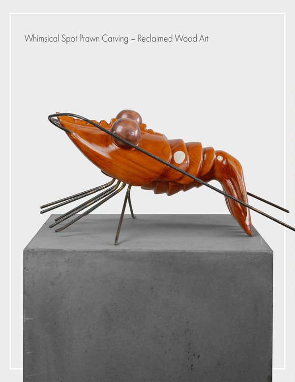 A splash of coastal charm with this hand-carved caricature of a spot prawn, crafted from a weathered old fence post. This piece is rich with character, featuring the natural textures and imperfections of reclaimed wood, brought to life with playful expression and rustic detail.